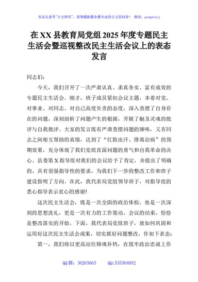 / 在XX县教育局党组2025年度专题民主生活会暨巡视整改民主生活会议上的表态发言