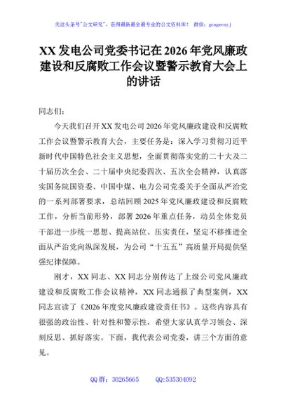 / XX发电公司党委书记在2026年党风廉政建设和反腐败工作会议暨警示教育大会上的讲话