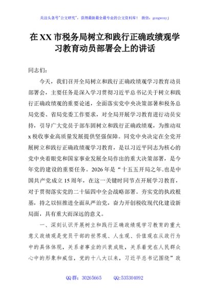 / 在XX市税务局树立和践行正确政绩观学习教育动员部署会上的讲话