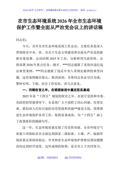 / 在市生态环境系统2026年全市生态环境保护工作暨全面从严治党会议上的讲话稿