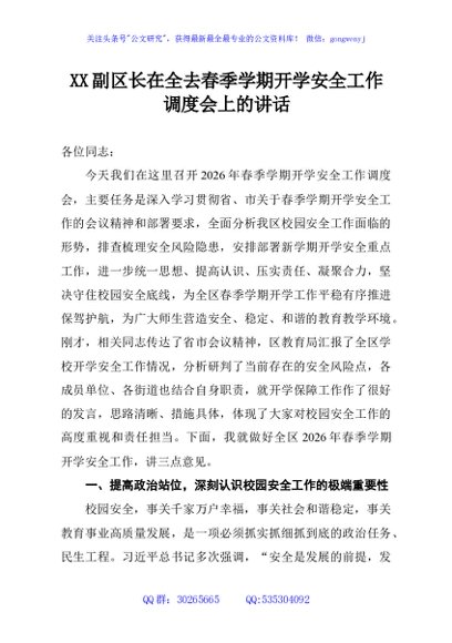 / XX副区长在全去春季学期开学安全工作调度会上的讲话