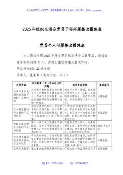 / 2025年组织生活会党员干部问题整改措施表