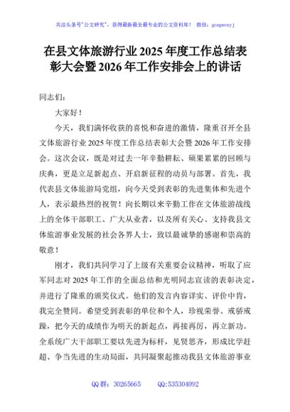 / 在县文体旅游行业2025年度工作总结表彰大会暨2026年工作安排会上的讲话