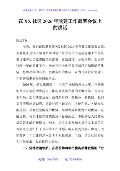 / 在XX社区2026年党建工作部署会议上的讲话