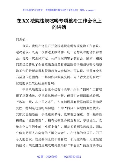 / 在XX法院违规吃喝专项整治工作会议上的讲话