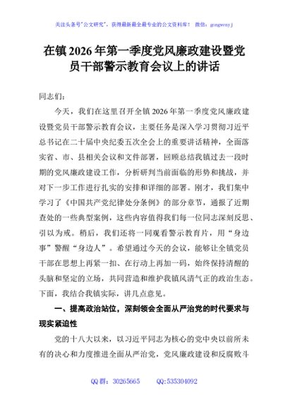 / 在镇2026年第一季度党风廉政建设暨党员干部警示教育会议上的讲话