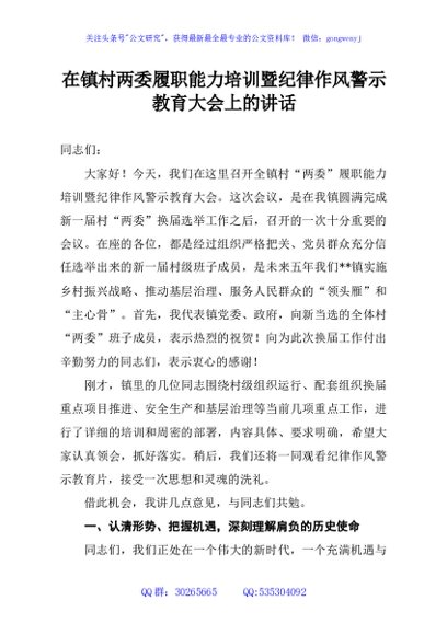 / 在镇村两委履职能力培训暨纪律作风警示教育大会上的讲话
