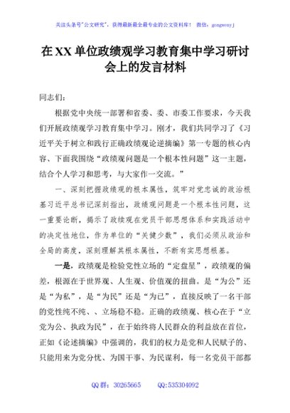 在XX单位政绩观学习教育集中学习研讨会上的发言材料