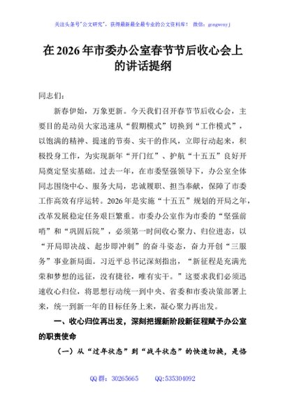 / 在2026年市委办公室春节节后收心会上的讲话提纲
