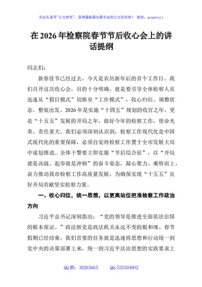 / 在2026年检察院春节节后收心会上的讲话提纲