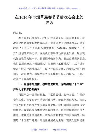 / 在2026年市烟草局春节节后收心会上的讲话