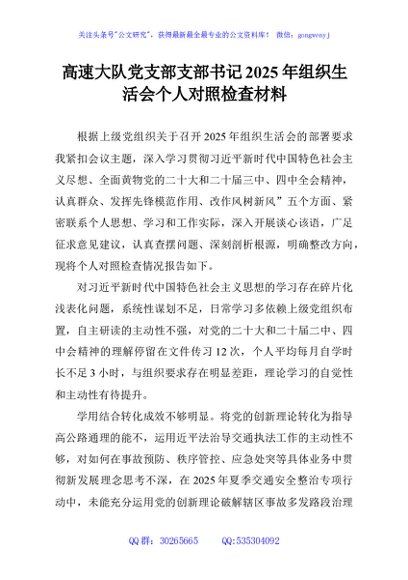 / 高速大队党支部支部书记2025年组织生活会个人对照检查材料
