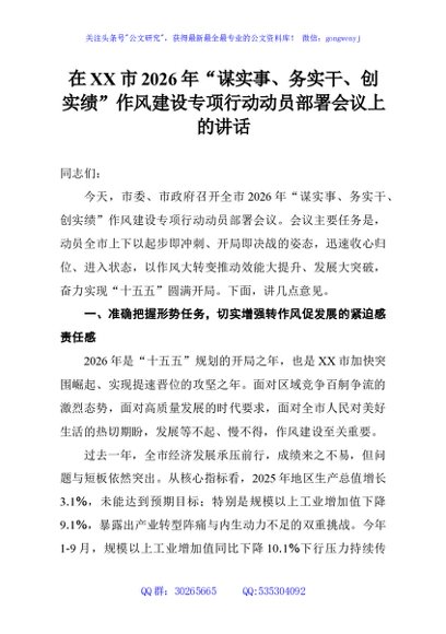 / 在XX市2026年“谋实事、务实干、创实绩”作风建设专项行动动员部署会议上的讲话