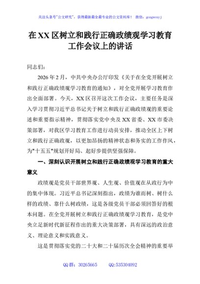 / 在XX区树立和践行正确政绩观学习教育工作会议上的讲话
