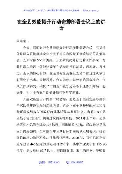/ 在全县效能提升行动安排部署会议上的讲话