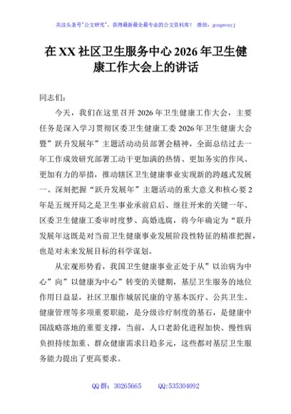 / 在XX社区卫生服务中心2026年卫生健康工作大会上的讲话