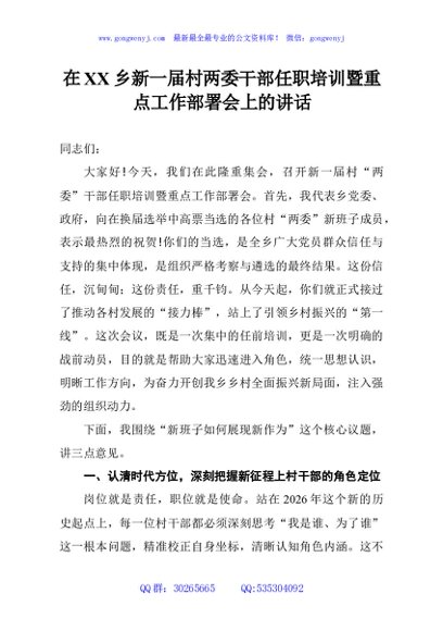 / 在XX乡新一届村两委干部任职培训暨重点工作部署会上的讲话