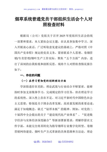 / 烟草系统普通党员干部组织生活会个人对照检查材料