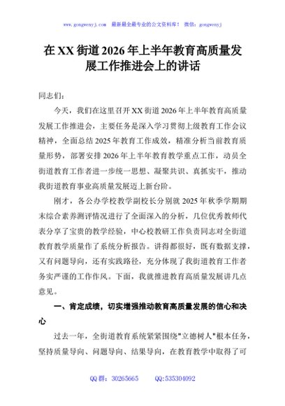/ 在XX街道2026年上半年教育高质量发展工作推进会上的讲话