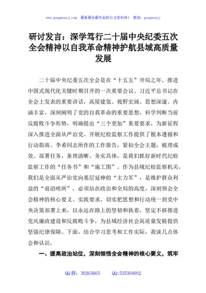 / 研讨发言:深学笃行二十届中央纪委五次全会精神以自我革命精神护航县域高质量发展