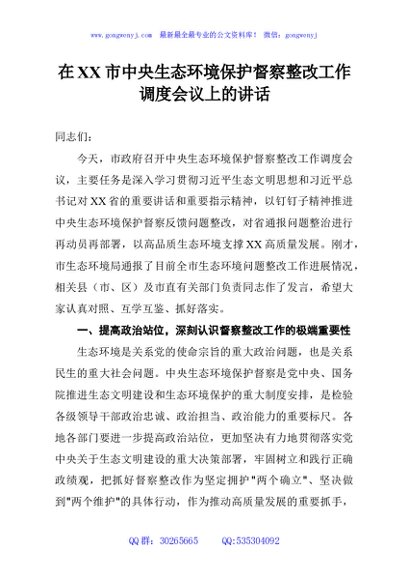 / 在XX市中央生态环境保护督察整改工作调度会议上的讲话
