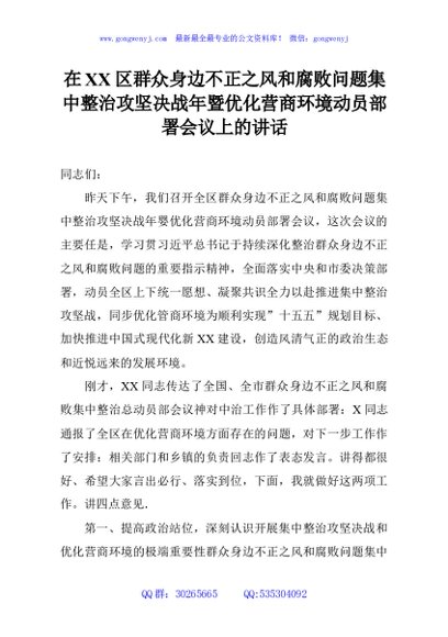 / 在XX区群众身边不正之风和腐败问题集中整治攻坚决战年暨优化营商环境动员部署会议上的讲话