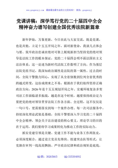 / 党课讲稿:深学笃行党的二十届四中全会精神奋力谱写创建全国优秀法院新篇章