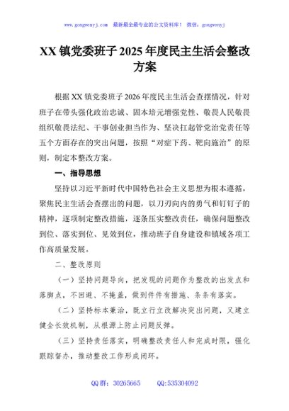 / XX镇党委班子2025年度民主生活会整改方案