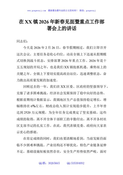 / 在XX镇2026年新春见面暨重点工作部署会上的讲话