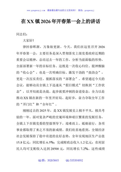 / 在XX镇2026年开春第一会上的讲话
