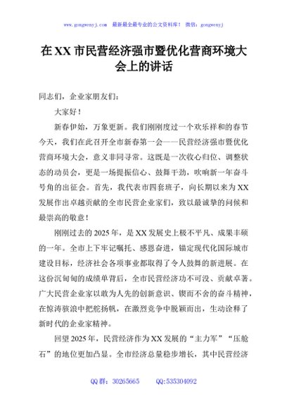 / 在XX市民营经济强市暨优化营商环境大会上的讲话