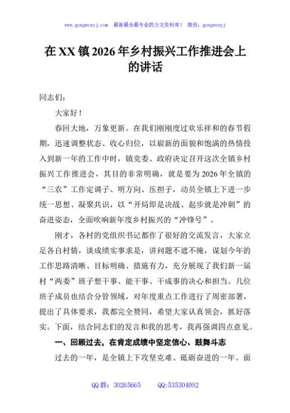 / 在XX镇2026年乡村振兴工作推进会上的讲话