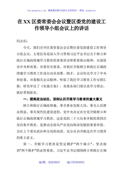 / 在XX区委常委会会议暨区委党的建设工作领导小组会议上的讲话