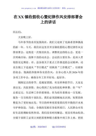 / 在XX镇收假收心暨纪律作风安排部署会上的讲话