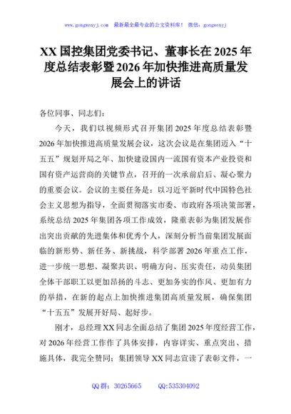 / XX国控集团党委书记、董事长在2025年度总结表彰暨2026年加快推进高质量发展会上的讲话