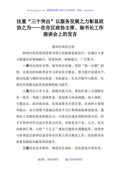/ 注重“三个突出”以服务发展之力彰显政协之为——在市区政协主席、秘书长工作座谈会上的发言