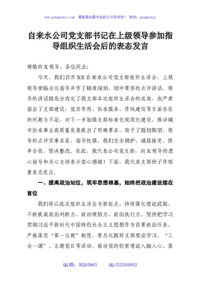 / 自来水公司党支部书记在上级领导参加指导组织生活会后的表态发言