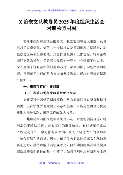 / X治安支队教导员2025年度组织生活会对照检查材料