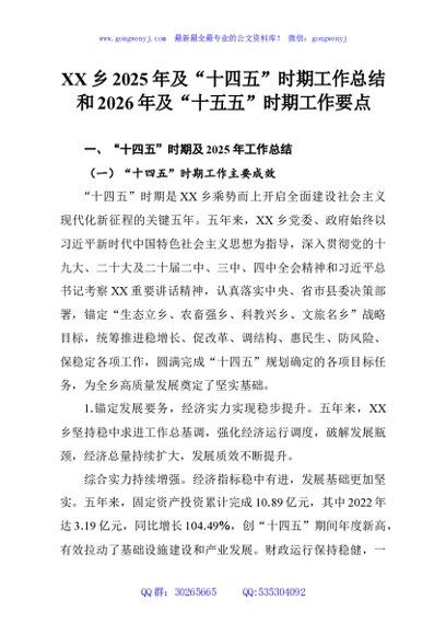 / XX乡2025年及“十四五”时期工作总结和2026年及“十五五”时期工作要点