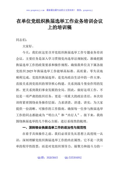 / 在单位党组织换届选举工作业务培训会议上的培训稿
