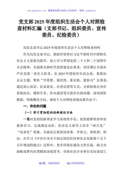 / 党支部2025年度组织生活会个人对照检查材料汇编(支部书记、组织委员、宣传委员、纪检委员)
