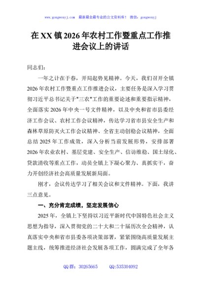 / 在XX镇2026年农村工作暨重点工作推进会议上的讲话