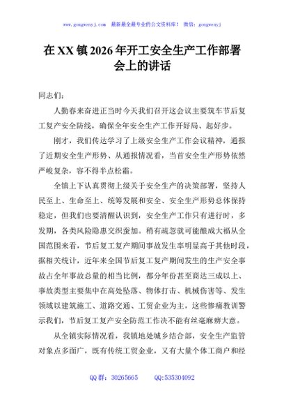 / 在XX镇2026年开工安全生产工作部署会上的讲话