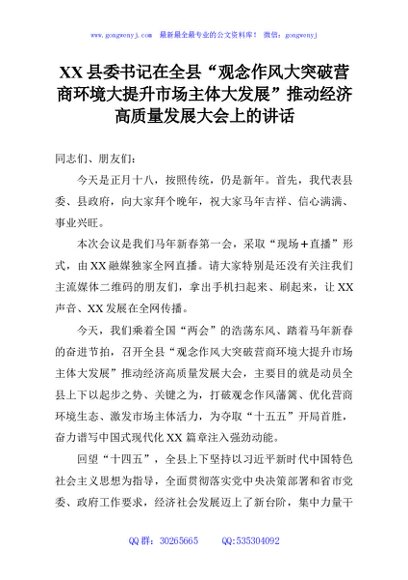 / XX县委书记在全县“观念作风大突破营商环境大提升市场主体大发展”推动经济高质量发展大会上的讲话