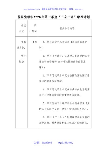 / 基层党组织2026年第一季度“三会一课”学习计划