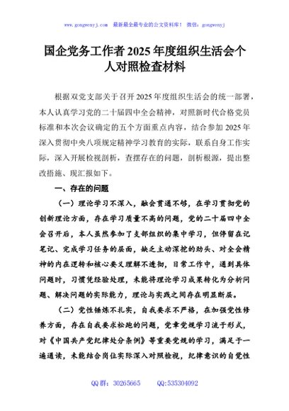 / 国企党务工作者2025年度组织生活会个人对照检查材料