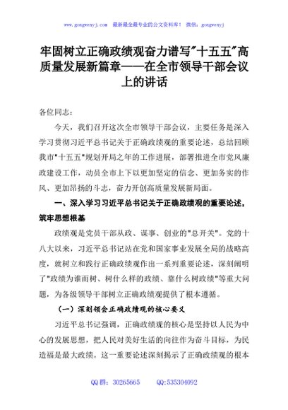 / 牢固树立正确政绩观奋力谱写十五五高质量发展新篇章——在全市领导干部会议上的讲话