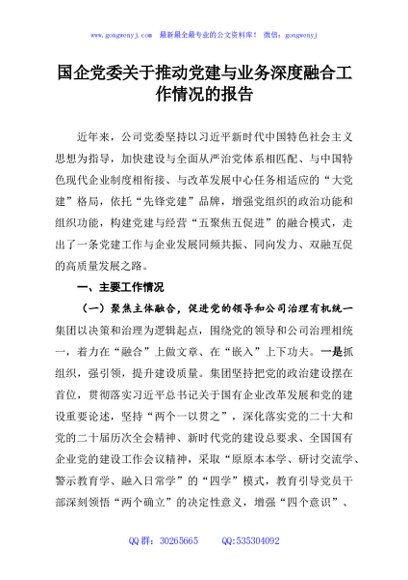 / 国企党委关于推动党建与业务深度融合工作情况的报告