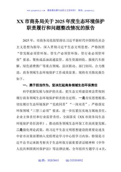 / XX市商务局关于2025年度生态环境保护职责履行和问题整改情况的报告