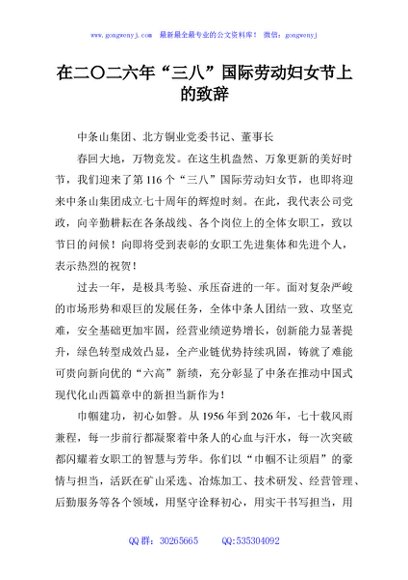 / 在二〇二六年“三八”国际劳动妇女节上的致辞(公司)